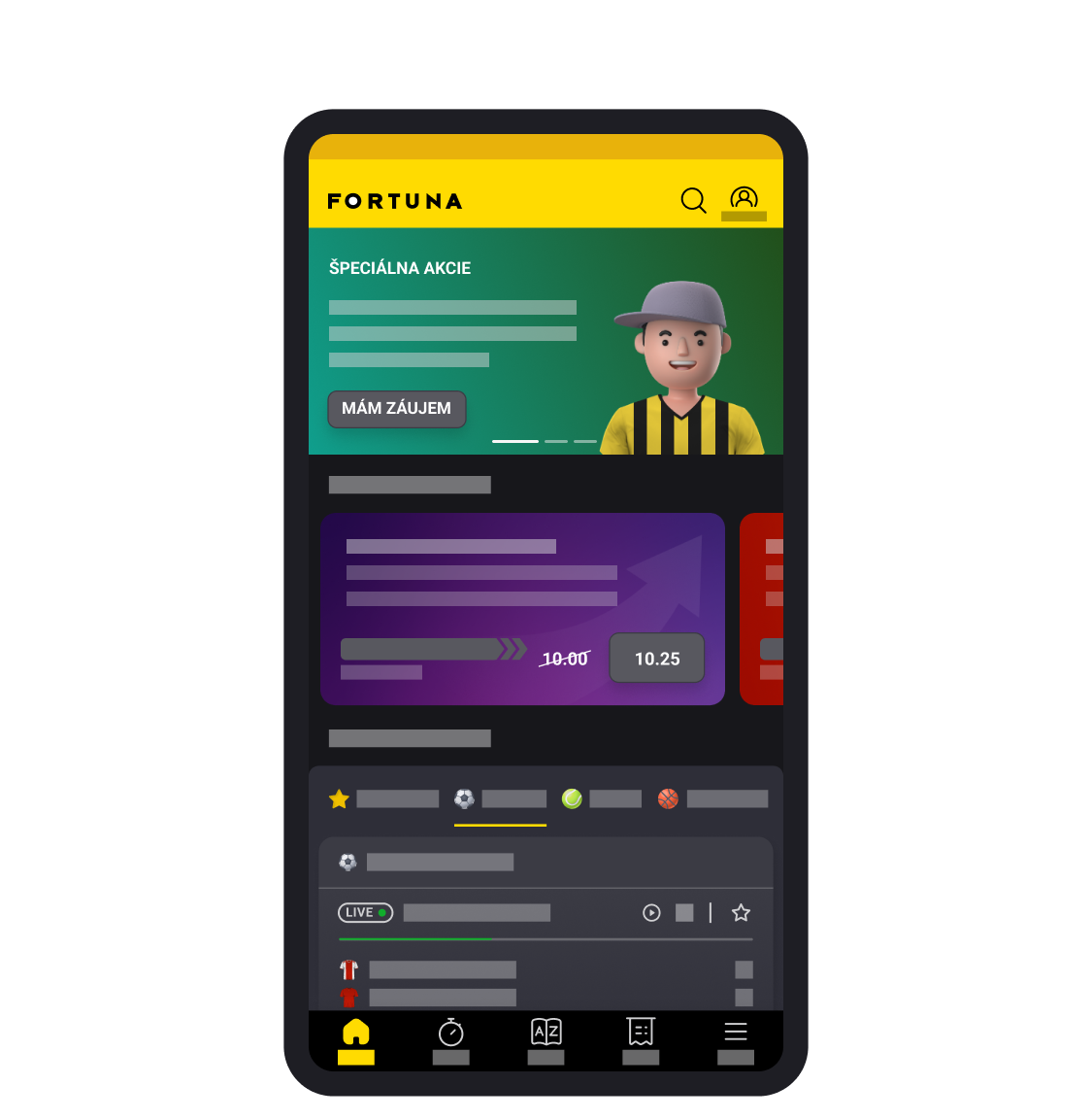 Stačí pár ťuknutí a všetko máš po ruke – od vkladu na konto, bleskového prepínania medzi rôznymi druhmi stávok až po výber tvojich výhier! Na úvodnej stránke appky okamžite nájdeš to, čo potrebuješ. Po novom je totiž všetko oveľa viac prehľadnejšie.